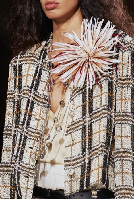 Las camelias, las perlas y el tweed no desaparecen, pero se transforman. El tweed se vuelve ligero, las flores se desdibujan sobre la seda y las perlas se sustituyen por bordados que brillan con sutileza.