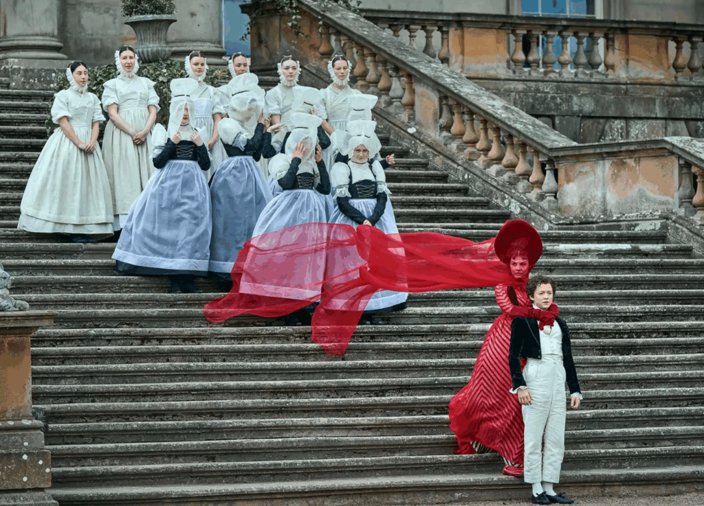 Los vestuarios de Elizabeth, interpretada por Mia Goth —actriz fetiche del cine de terror contemporáneo—, evocan la sensibilidad de la alta costura. Sus tejidos personalizados incluyen sedas en tonos verdes inspirados en la piedra malaquita, terciopelos iridiscentes reminiscentes de los escarabajos y velos translúcidos que construyen una atmósfera onírica y reflexiva, cercana al gesto contemplativo de la pintura.