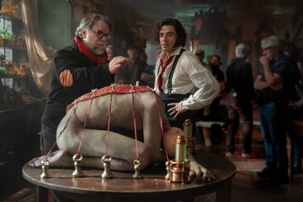 Por su parte, Victor Frankenstein, encarnado por el guatemalteco Oscar Isaac, se convierte en un eje cromático de la narrativa a través del uso del rojo, color recurrente y casi obsesivo en el imaginario de Del Toro.