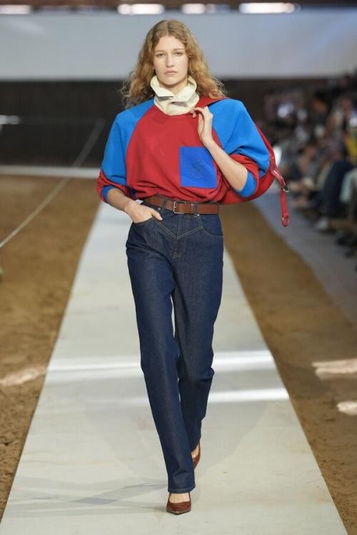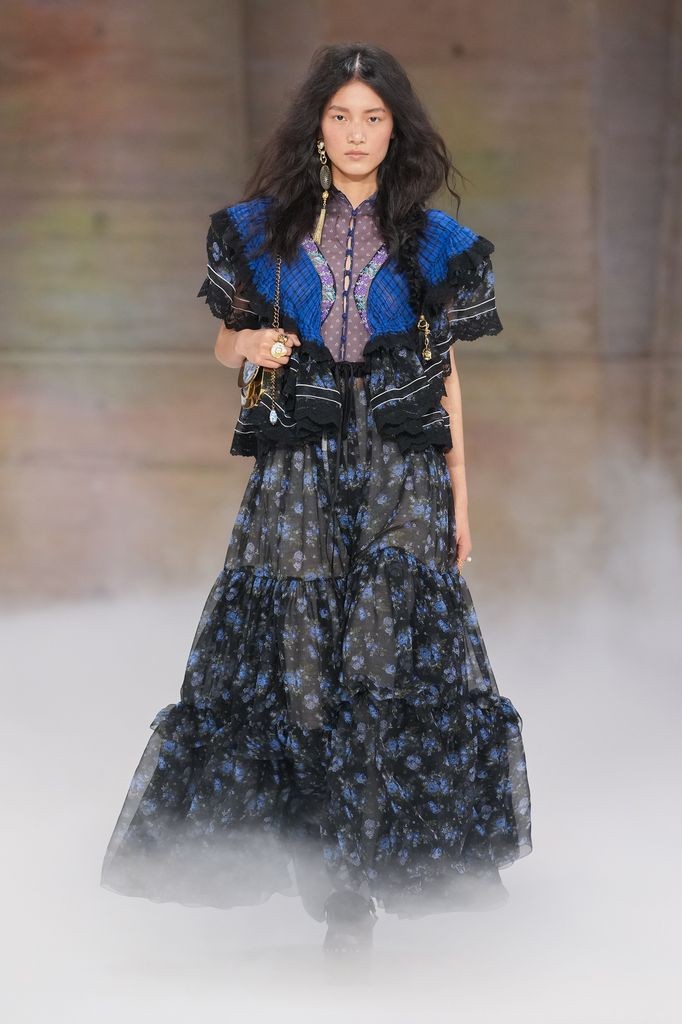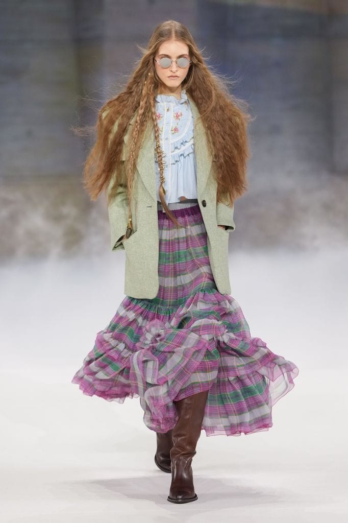 La pasarela mostró vestidos vaporosos, faldas con volantes, encajes y tejidos translúcidos que evocaban una silueta femenina nómada y libre. Las referencias visuales incluyeron el folclore europeo, así como imaginarios culturales asociados a figuras como Kate Moss en los años noventa o Kate Bush en los setenta. En el estilismo, vestidos y faldas boho se combinaron con botas altas de caña corrugada y zuecos de plataforma, mientras la paleta incorporó tonos beige, rojo, negro y azul cobalto.