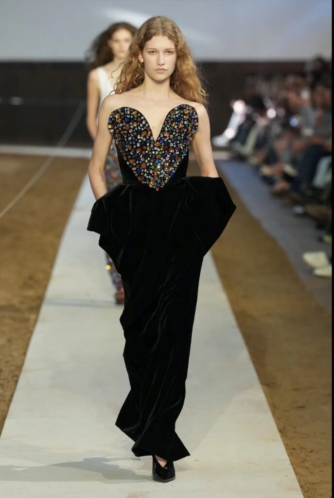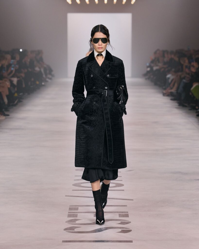 El negro fue el eje cromático de la propuesta. Vestidos, abrigos y trajes incluyeron encajes, transparencias, escotes en V y referencias a la sastrería italiana. Las siluetas incorporaron largos midi y blazers estructurados.
