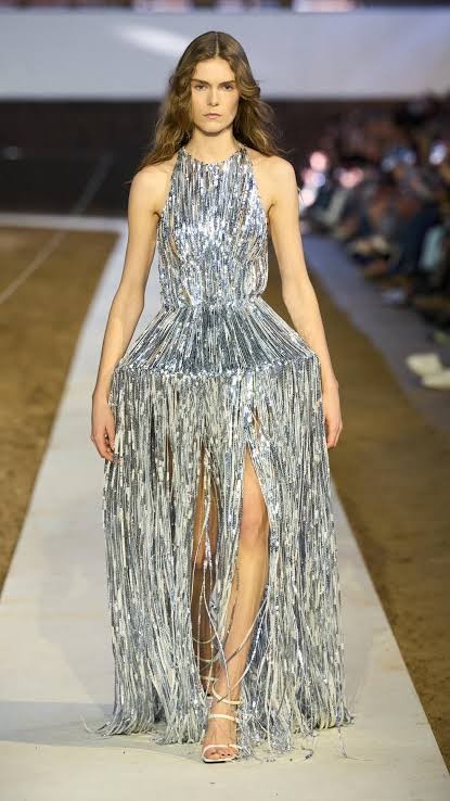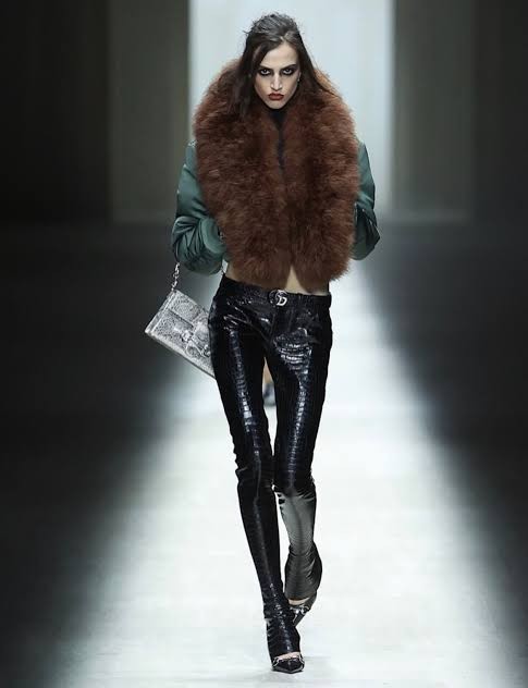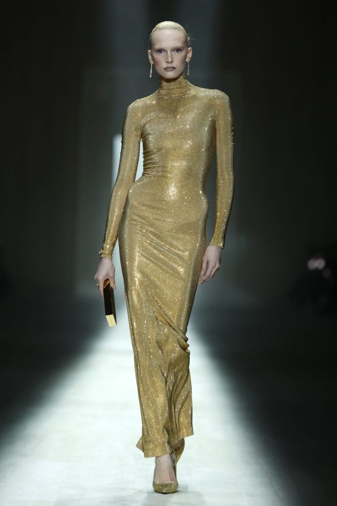 El desfile se presentó en un espacio monumental inspirado en museos italianos, rodeado de esculturas clásicas y acompañado por una banda sonora que transitaba de música clásica a techno. En la pasarela aparecieron códigos asociados al Gucci de finales de los noventa y comienzos de los 2000: vestidos ajustados, blazers con faldas lápiz, cuero, transparencias y acabados metalizados.