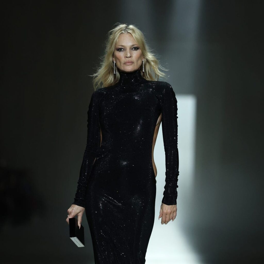 El desfile cerró con Kate Moss, una de las modelos más vinculadas a la etapa de Tom Ford en Gucci. La inglesa apareció con un vestido negro de lentejuelas con cortes laterales y espalda baja que remitía a la estética de finales de los noventa.