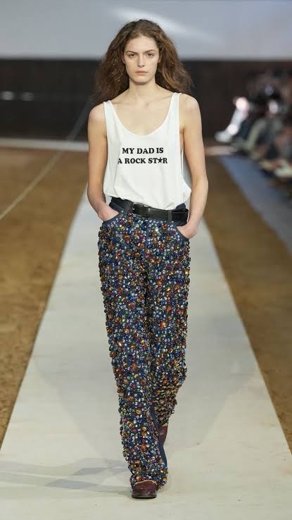 El cierre del desfile incluyó una camiseta blanca con el mensaje “My dad is a rock star”. En primera fila estaba Paul McCartney, quien grabó el momento con su teléfono.